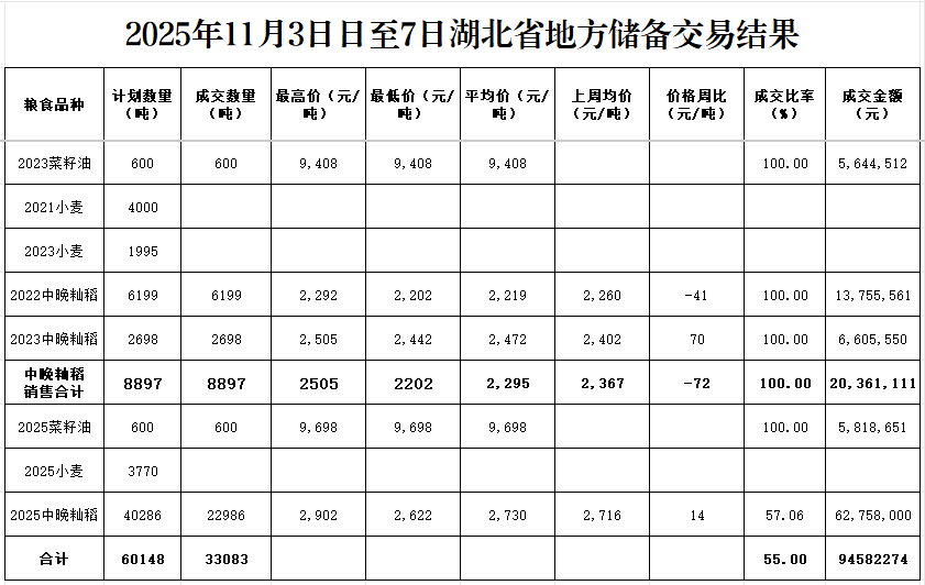 本周湖北地储成交各类粮油33083吨。其中销售:2023年菜籽油600吨,成交率100%,成交均价9408元/吨;2022年中晚籼稻6199吨,成交率100%,成交均价2219元/吨,环比下跌41元/吨;2023年中晚籼稻2698吨,成交率100%,成交均价2472元/吨,环比上涨70元/吨。采购:2025年菜籽油600吨,成交率100%,成交均价9698元/吨;2025年中晚籼稻22986吨,成交率57.06%,成交均价2730元/吨,环比上涨14元/吨。